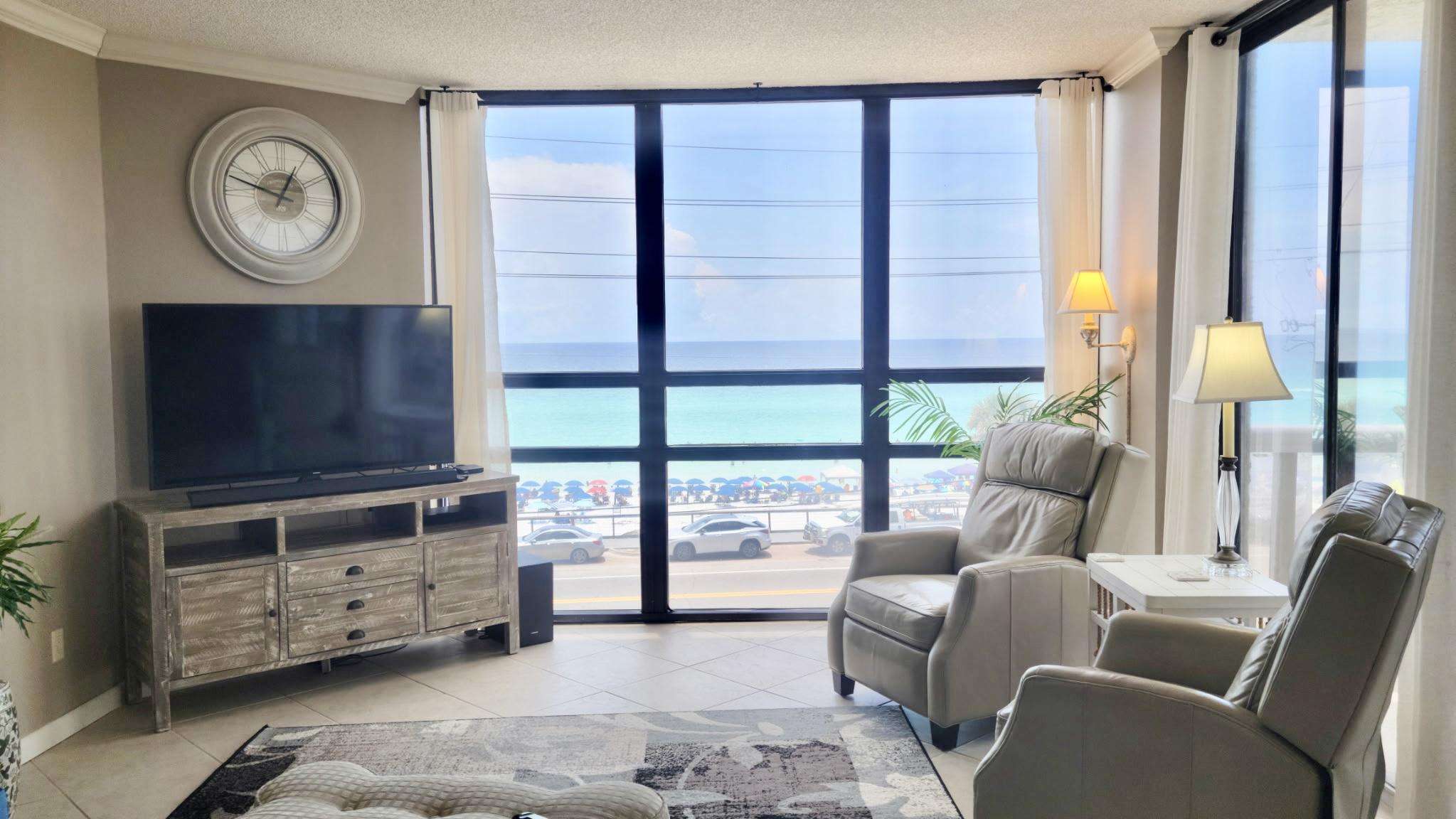 This beautiful condo has been decorated with a sophisticated beach theme. The gourmet kitchen, beautiful tiled floors, panoramic ceiling to floor windows, and many upgrades make this unit your perfect beach get-away!
