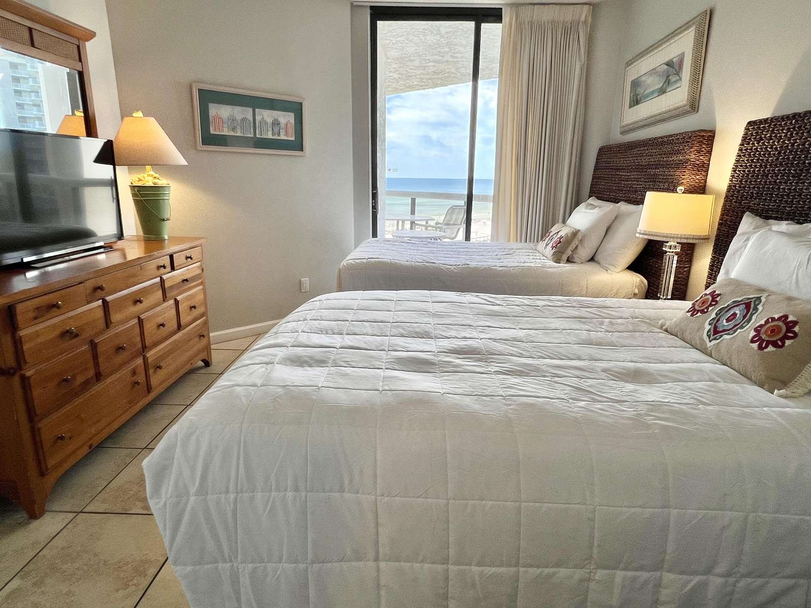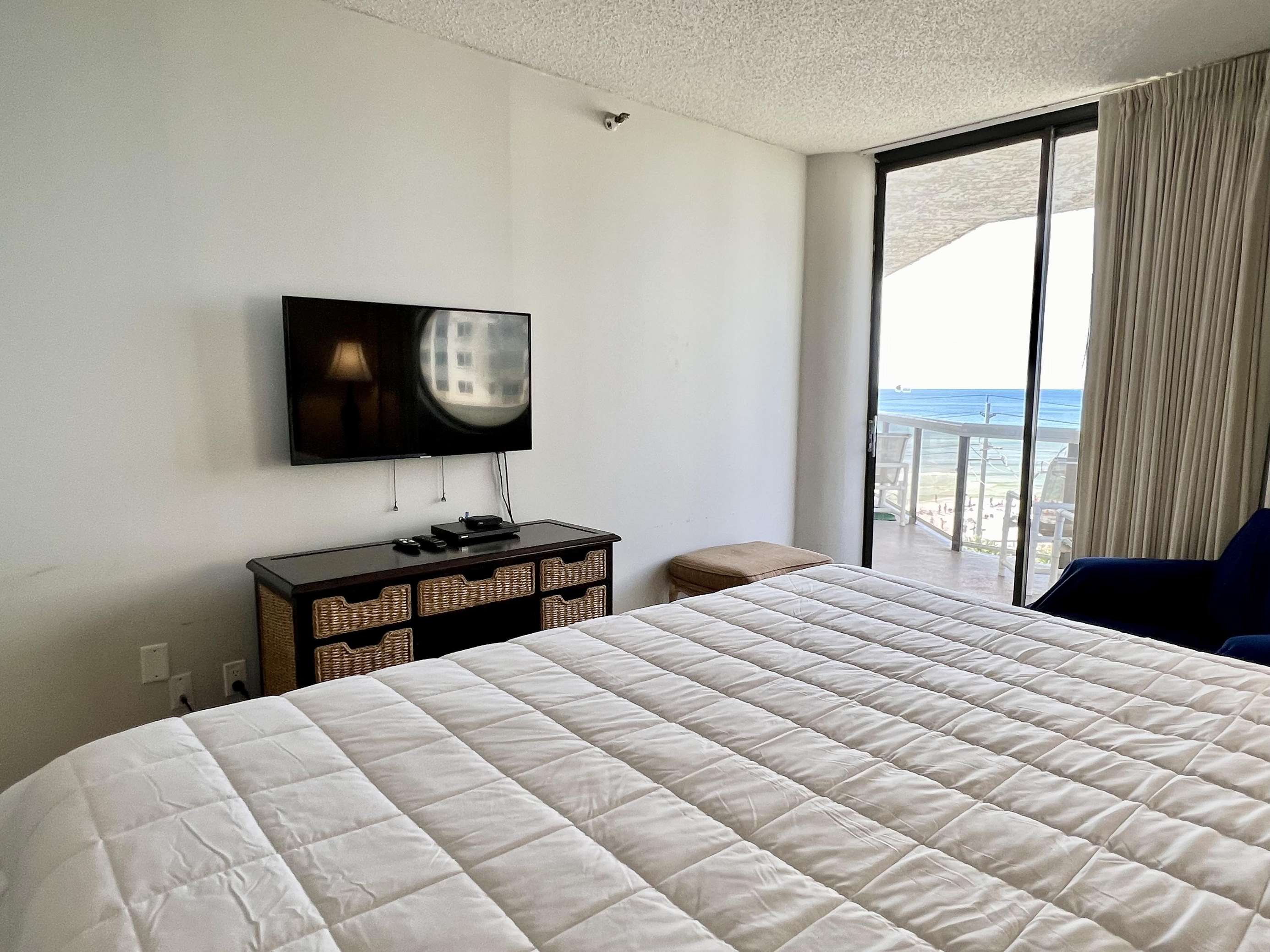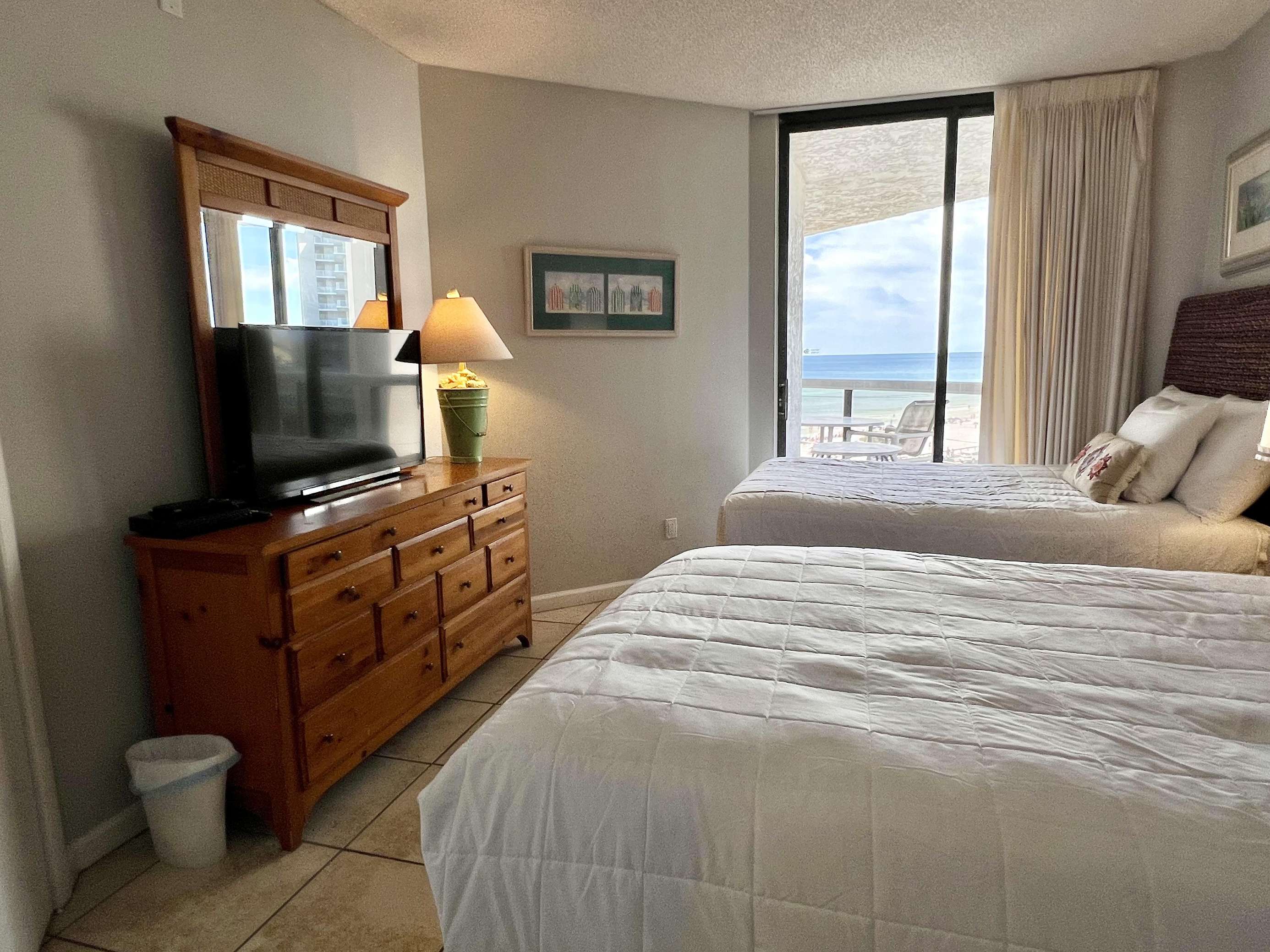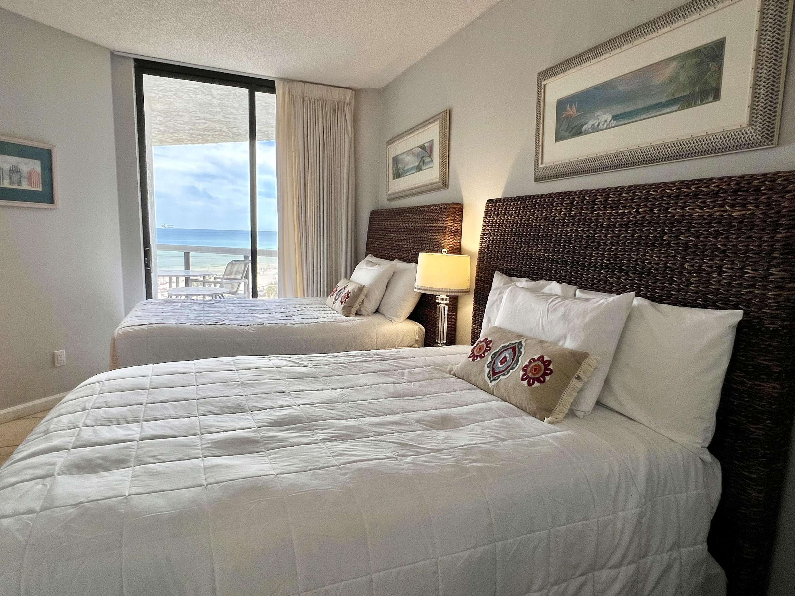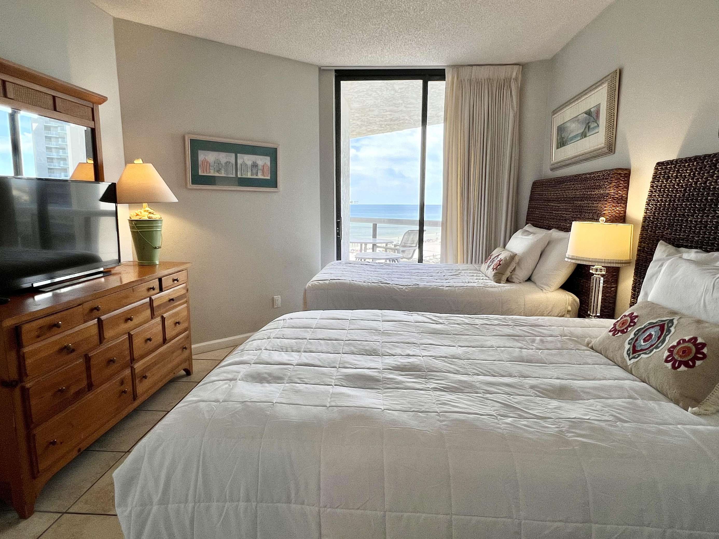 The master bedroom features a comfortable king sized bed, large en-suite bathroom, walk in closet, and balcony access with ocean views. The second bedroom features 2 full sized beds and balcony access with ocean views. There is a queen sized sleeper sofa in the living room.