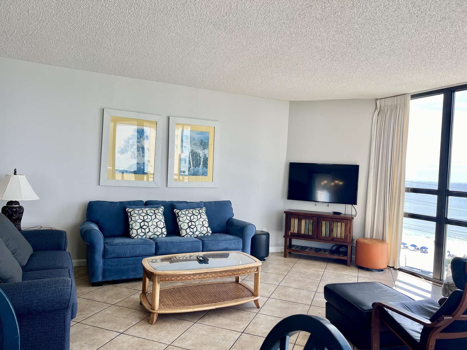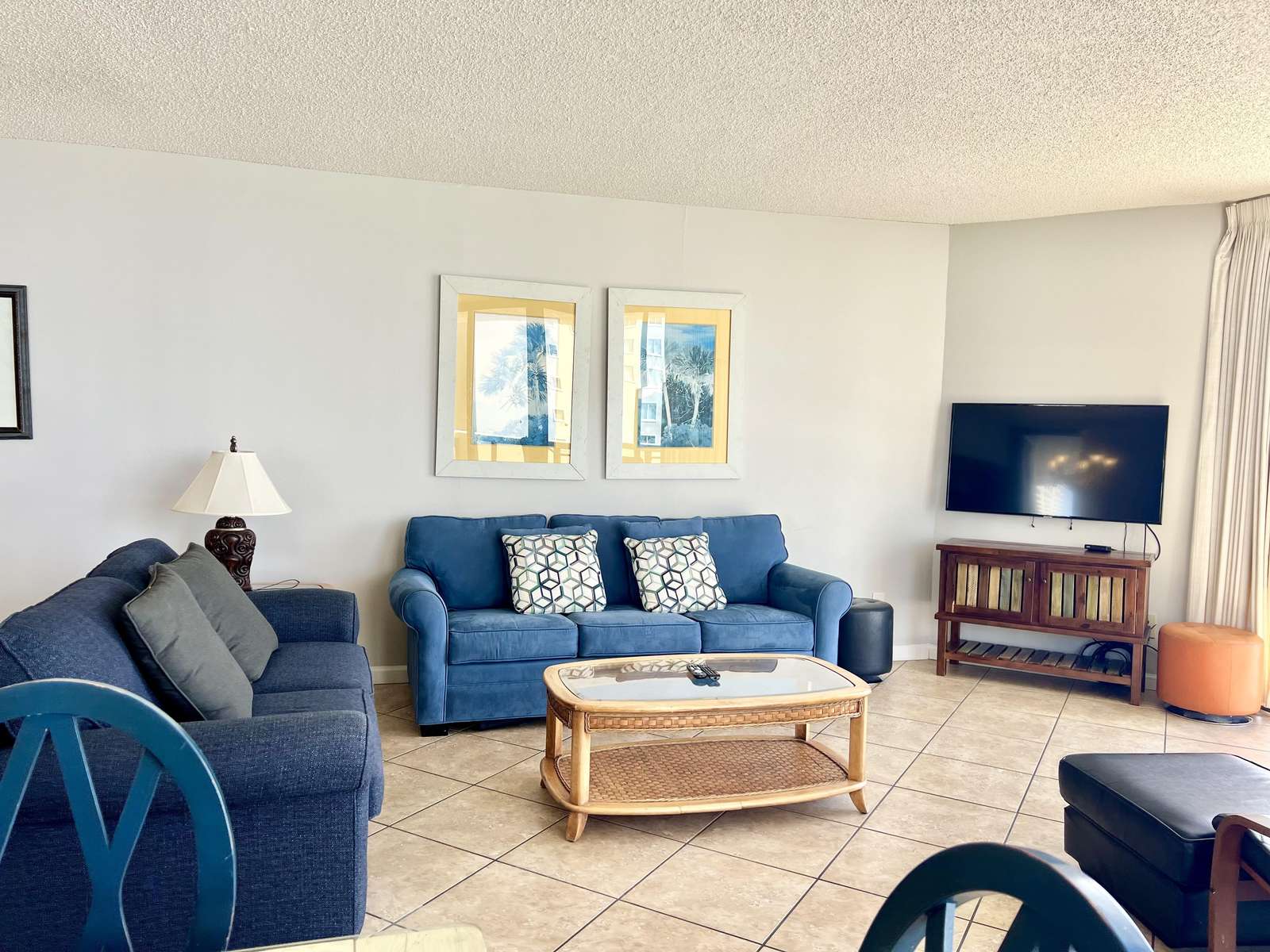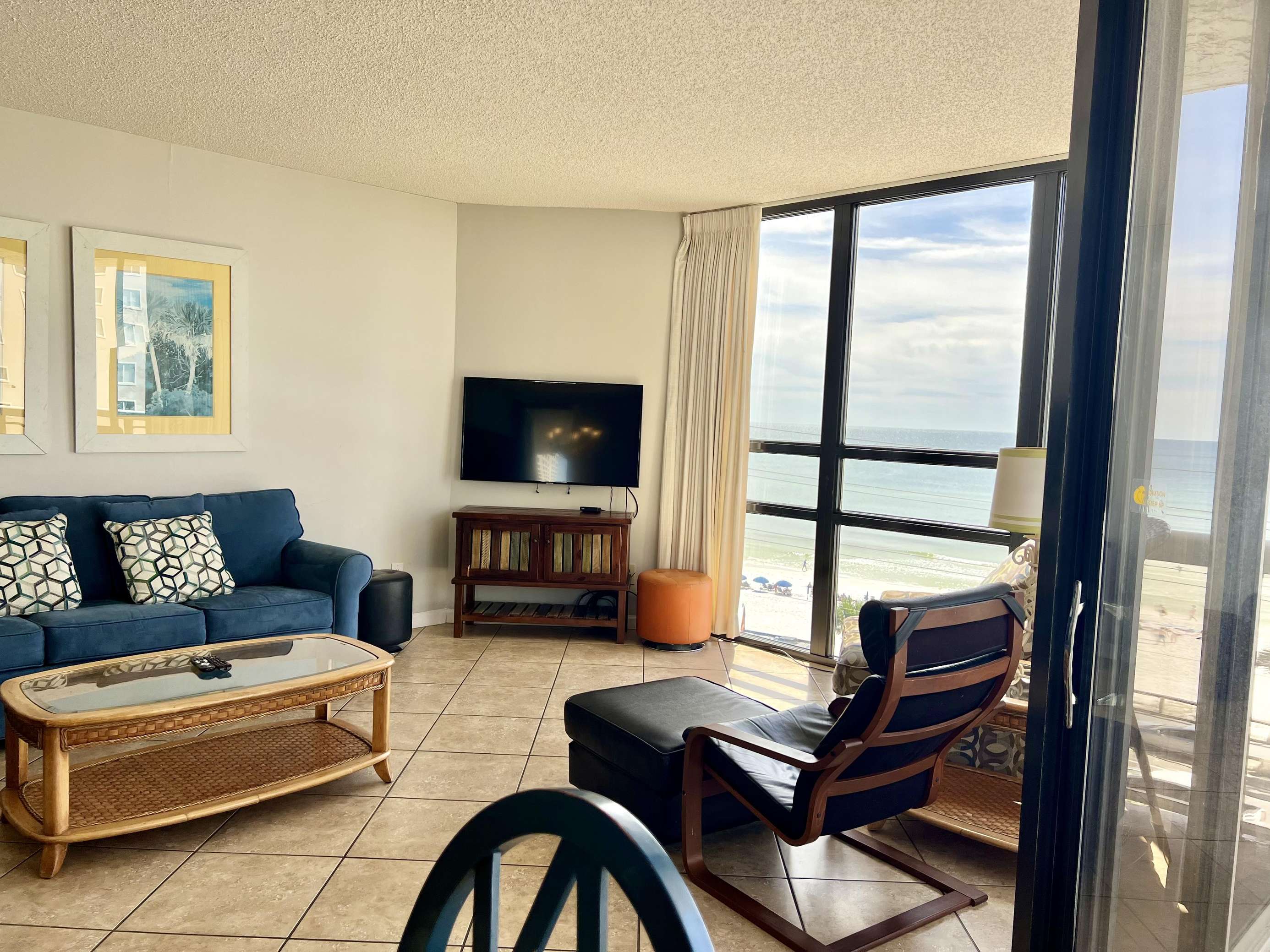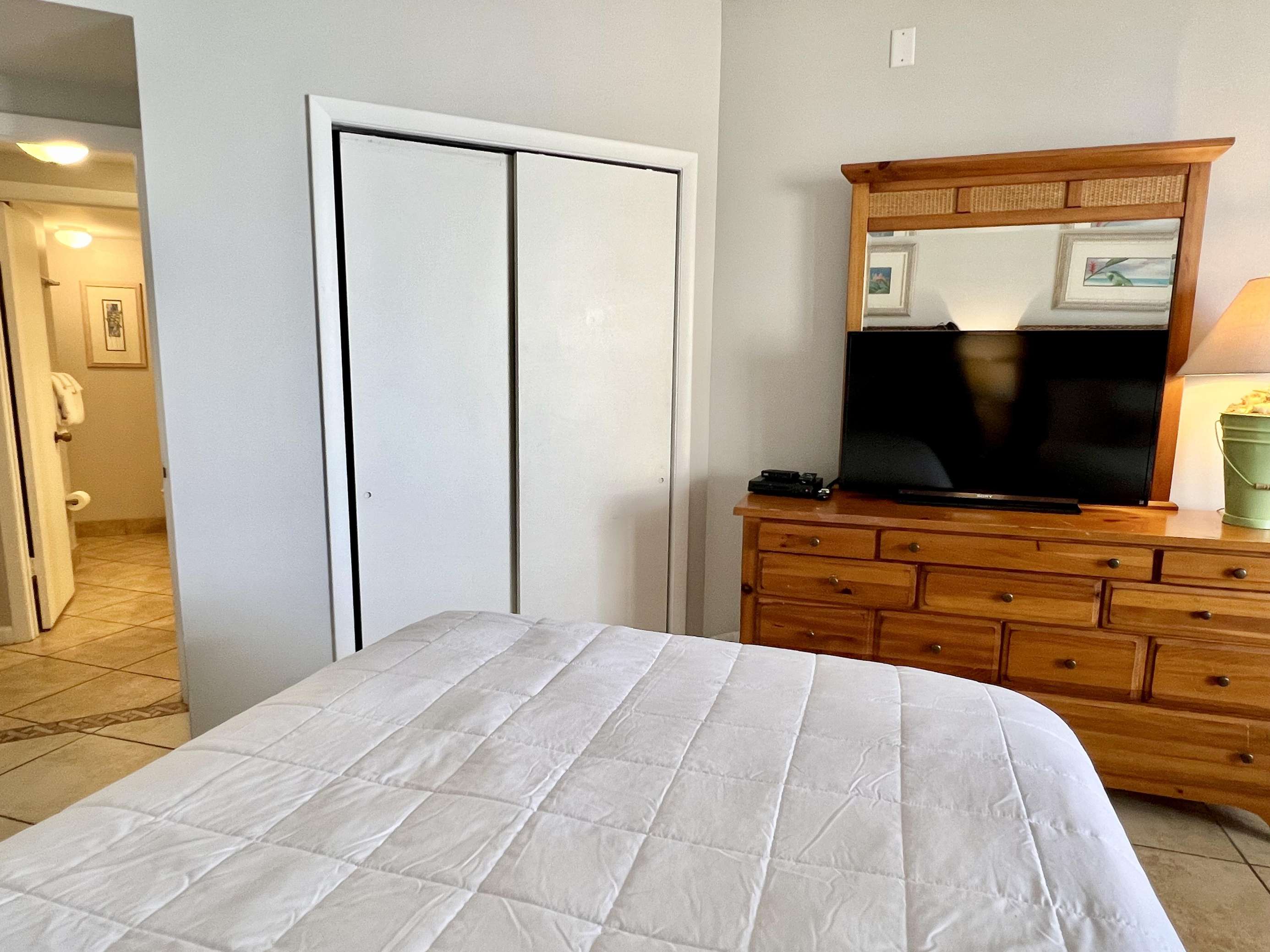 The master bedroom features a comfortable king sized bed, large en-suite bathroom, walk in closet, and balcony access with ocean views. The second bedroom features 2 full sized beds and balcony access with ocean views. There is a queen sized sleeper sofa in the living room.