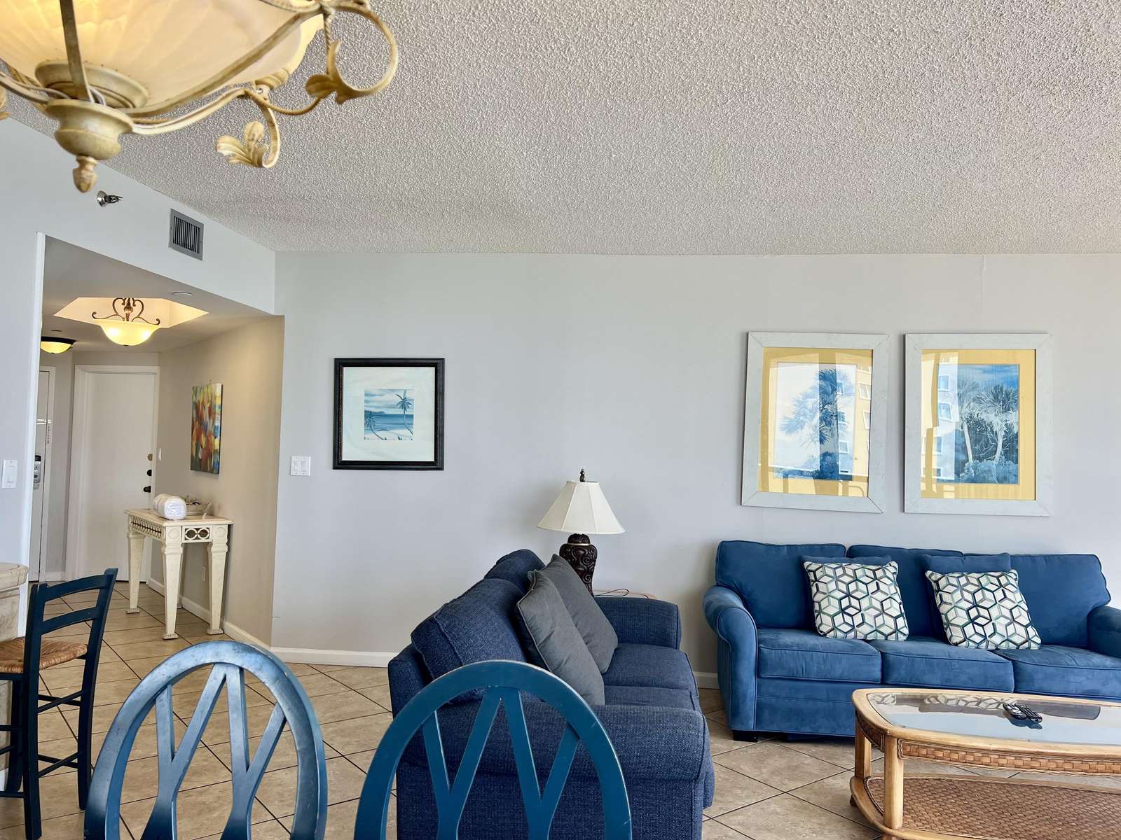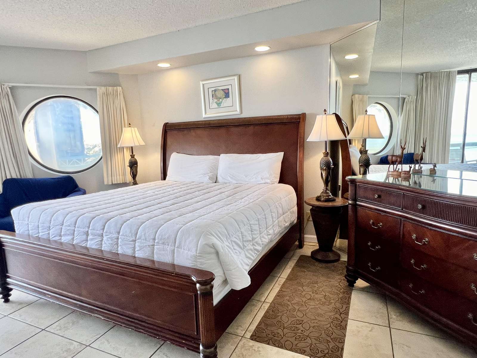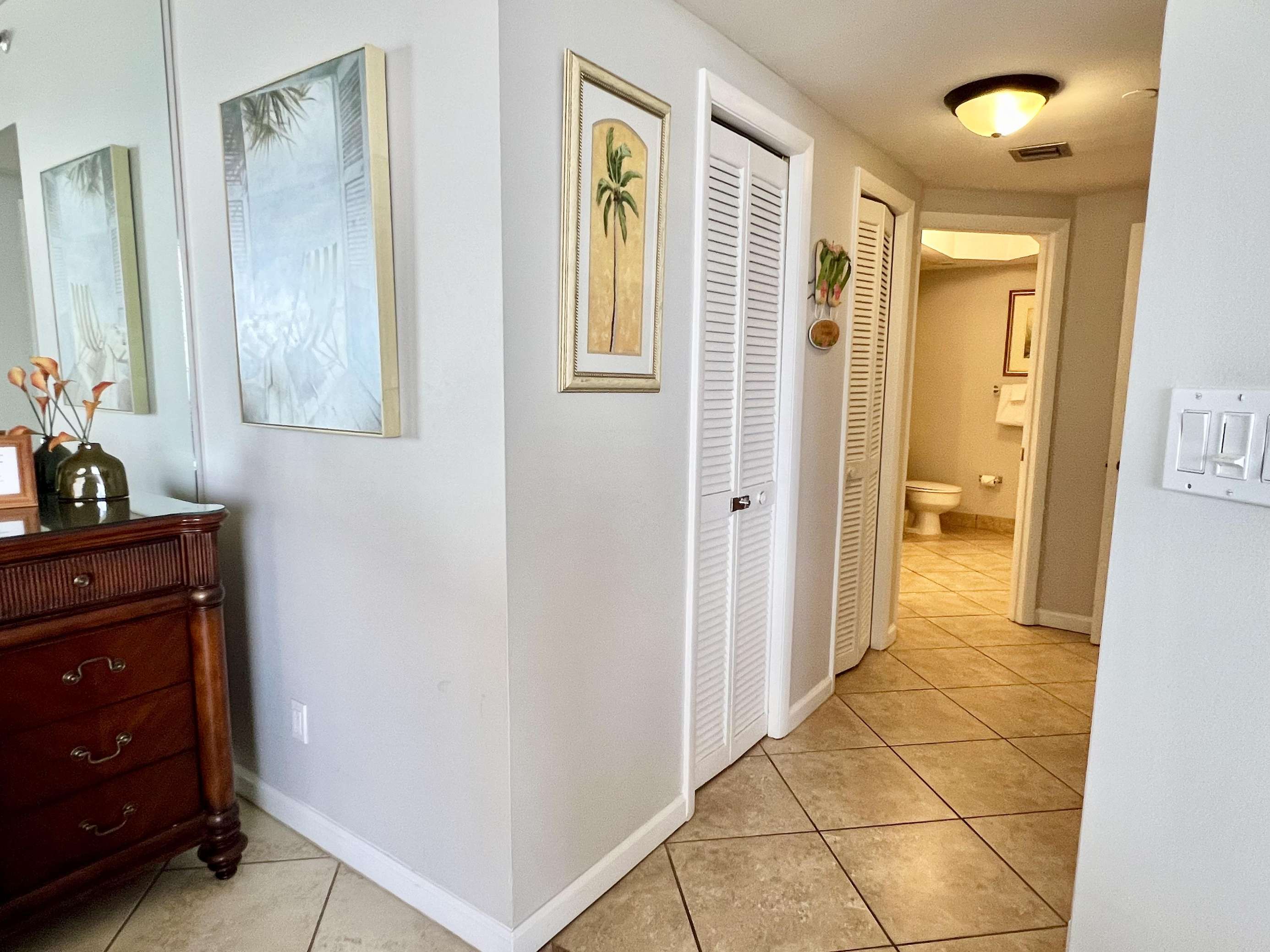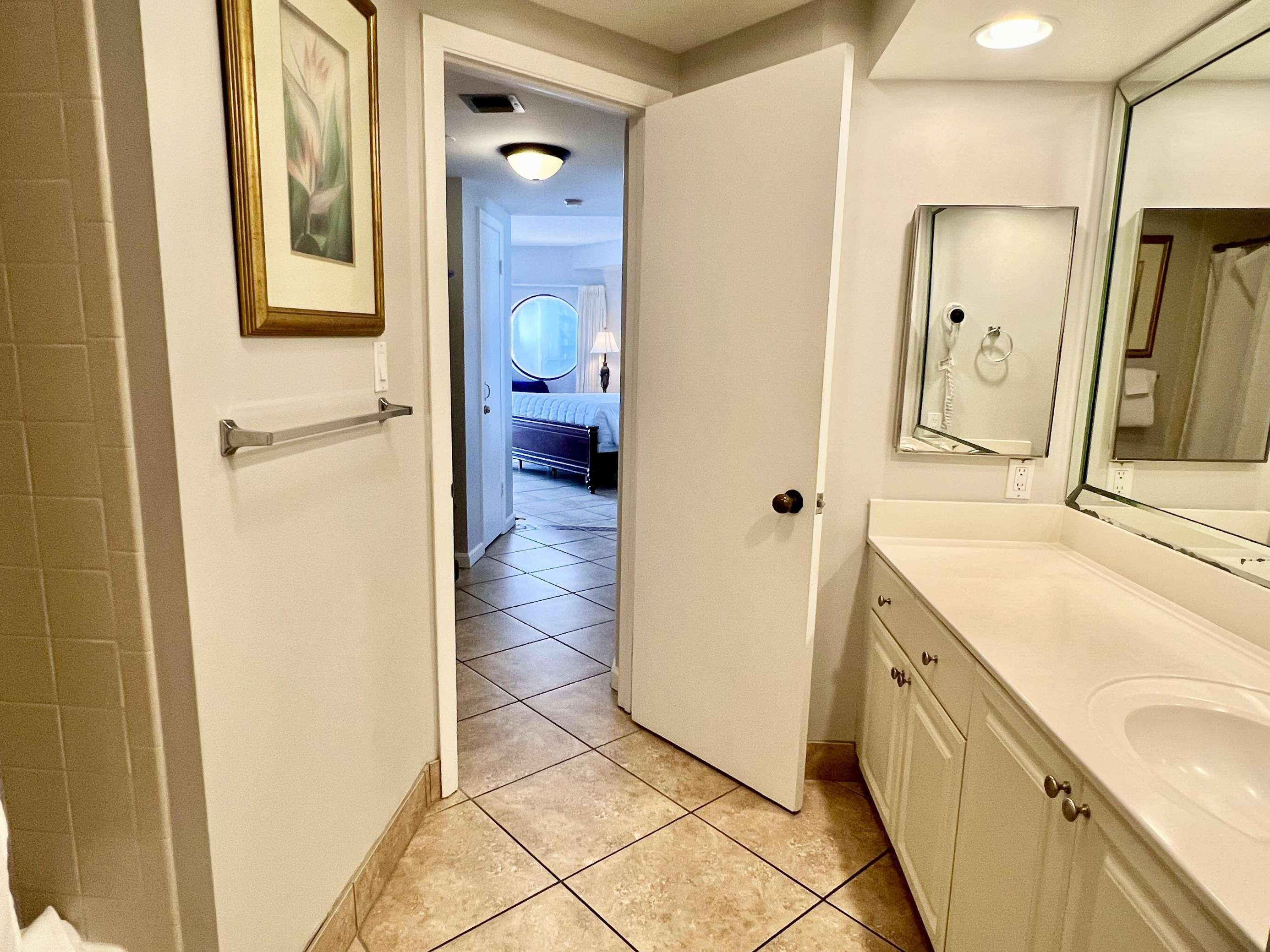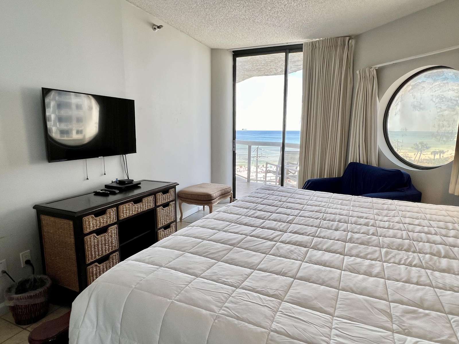 The master bedroom features a comfortable king sized bed, large en-suite bathroom, walk in closet, and balcony access with ocean views. The second bedroom features 2 full sized beds and balcony access with ocean views. There is a queen sized sleeper sofa in the living room.