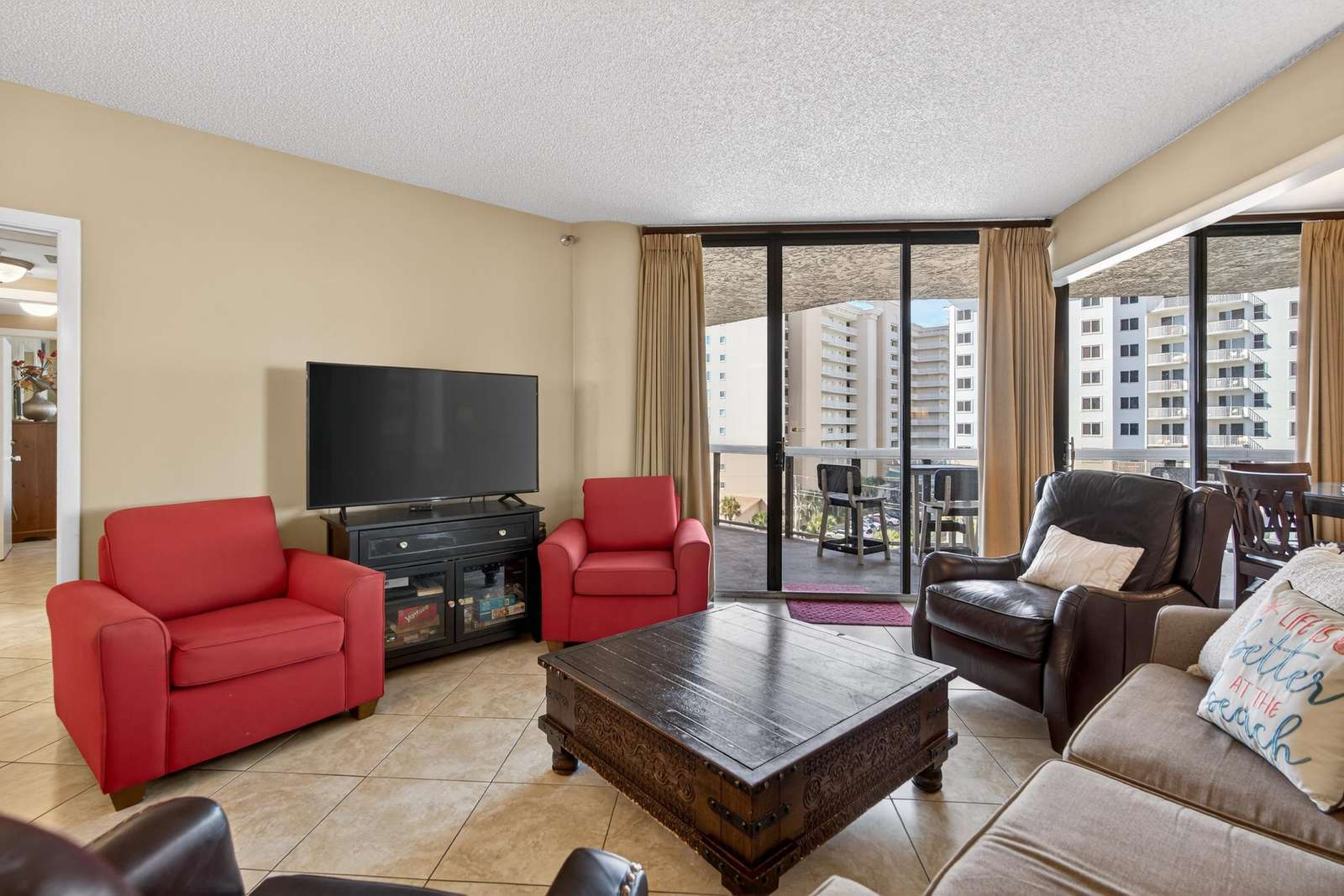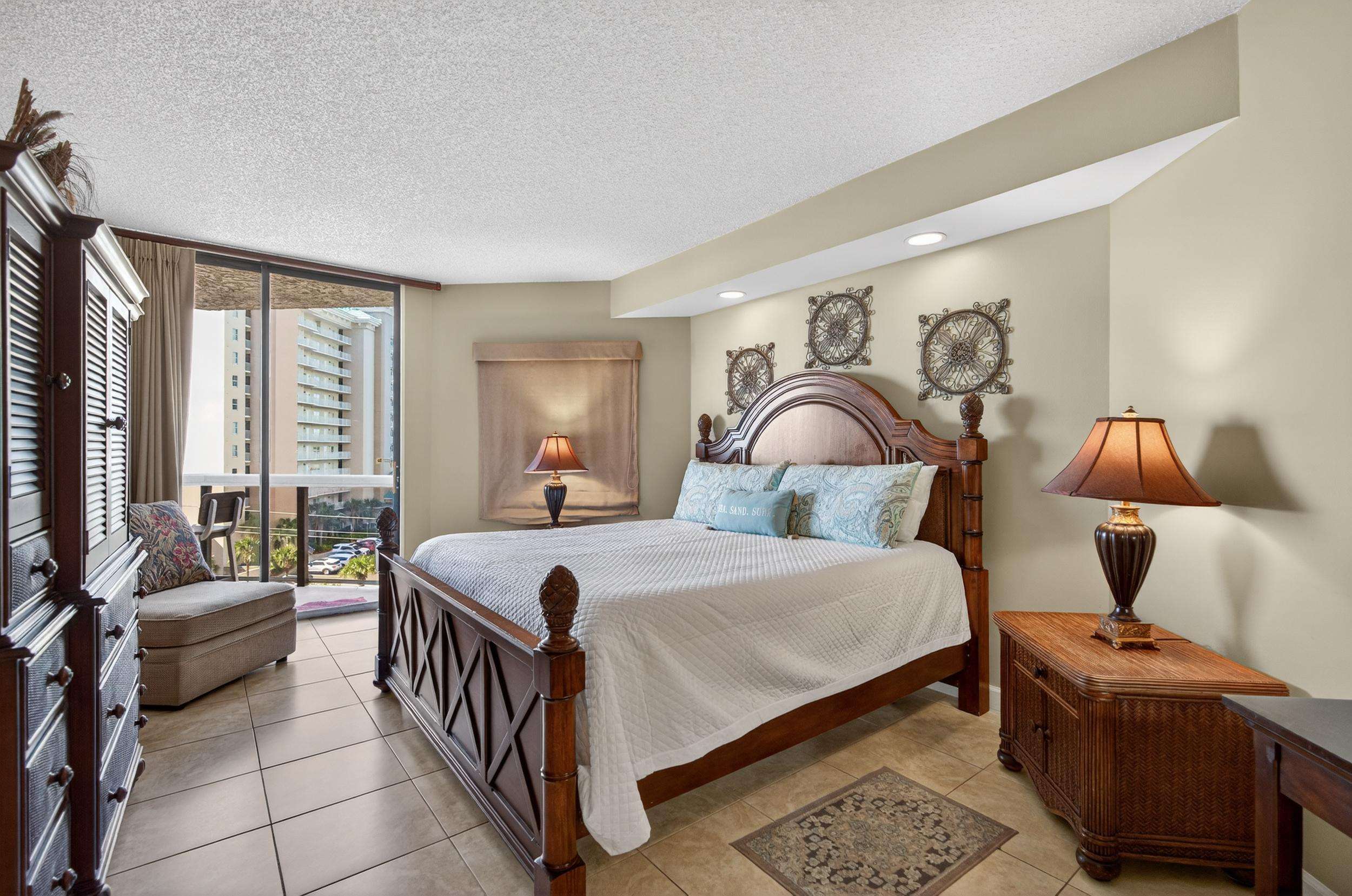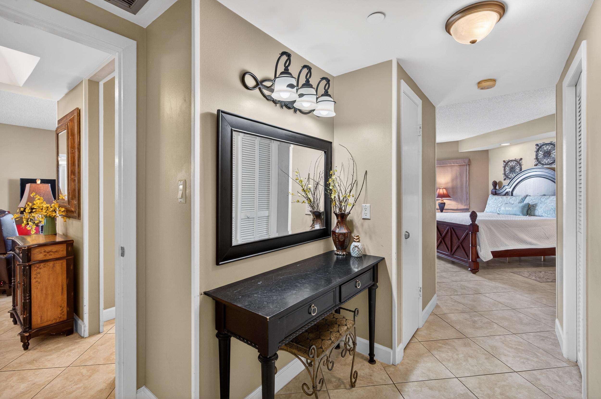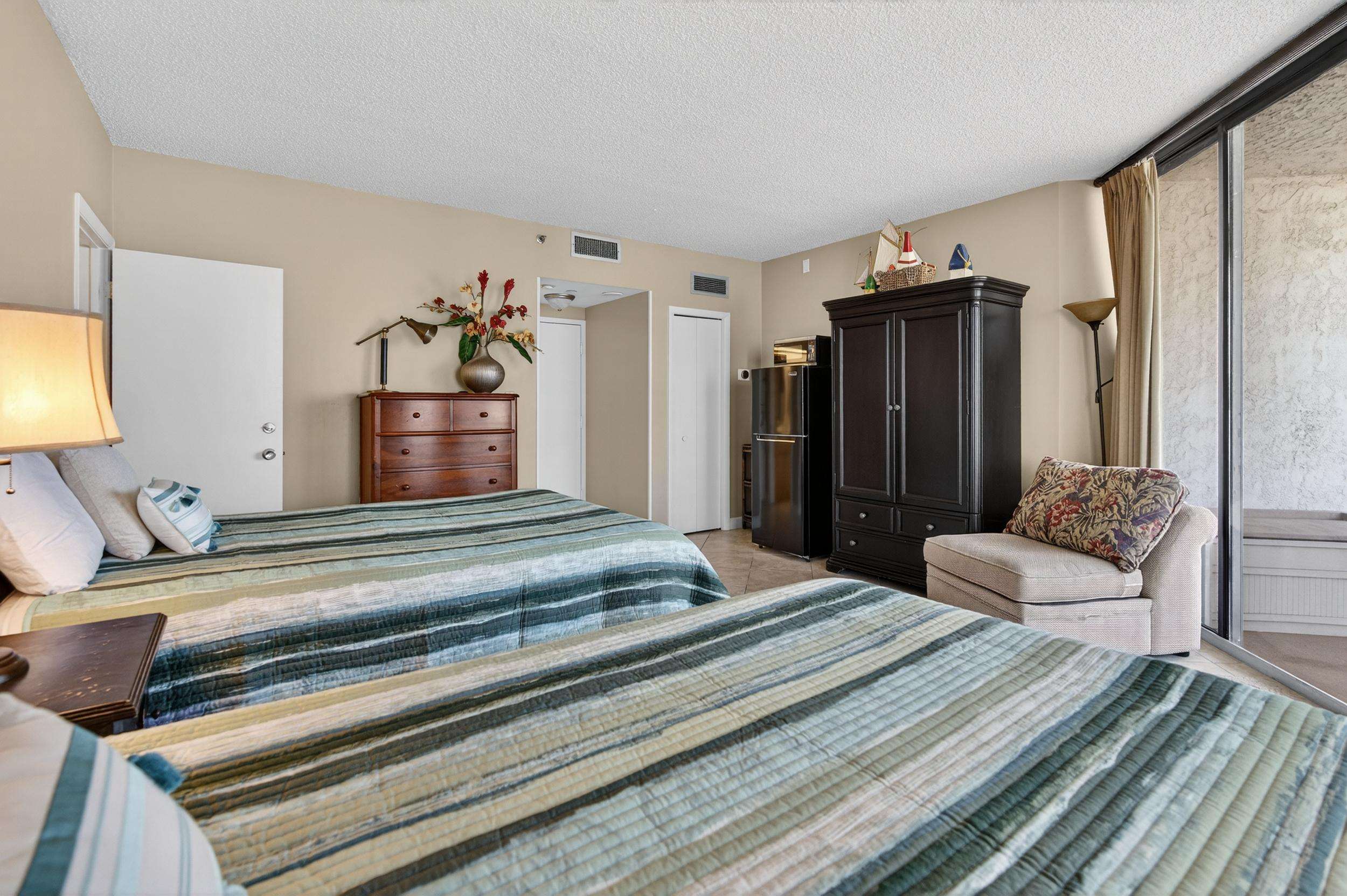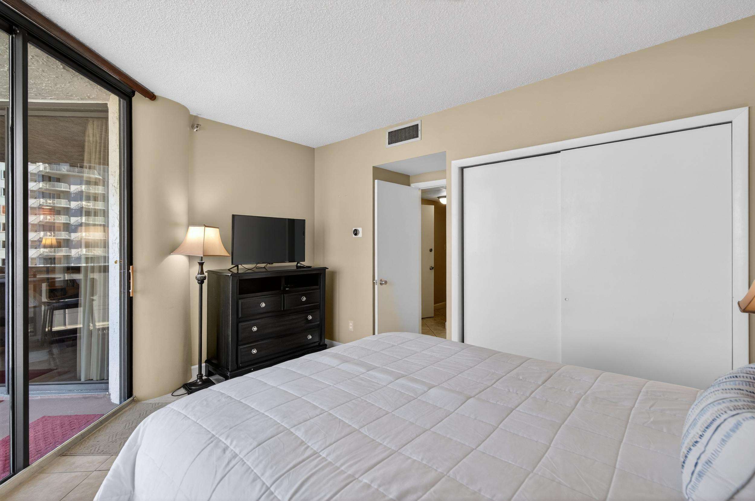 The large master features a a king-size bed, TV, large walk-in closet, and spacious master bath with large glass-enclosed tub/shower. The second bedroom features a queen bed TV and full bath. The 3rd bedroom has 2 queen beds beds, TV, large closet, full bath, small refrigerator, coffee pot, and microwave.
