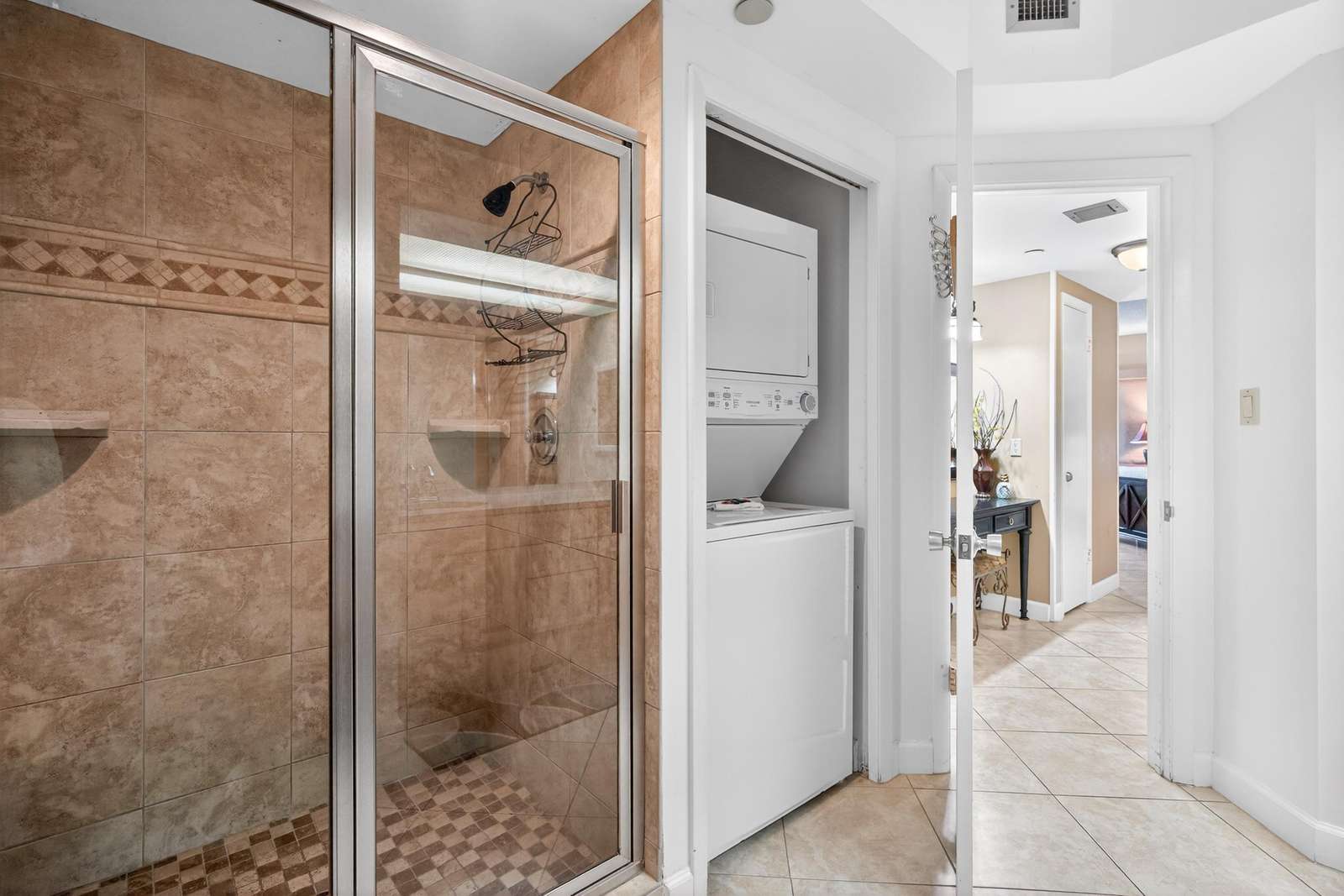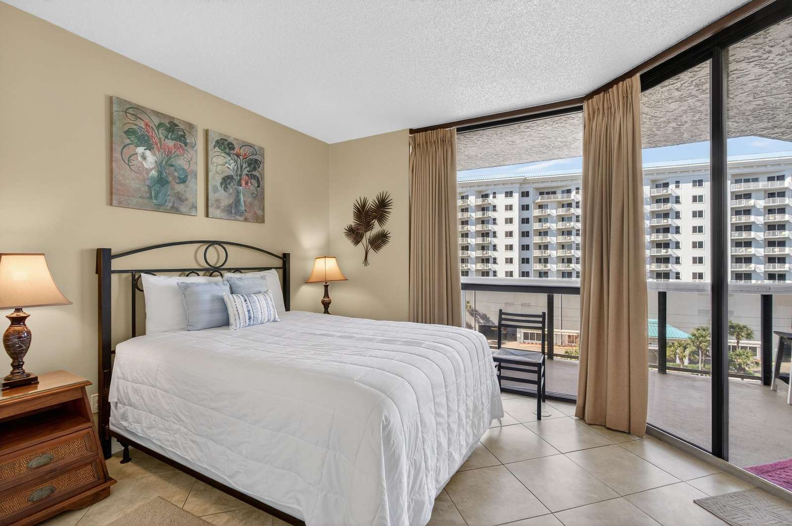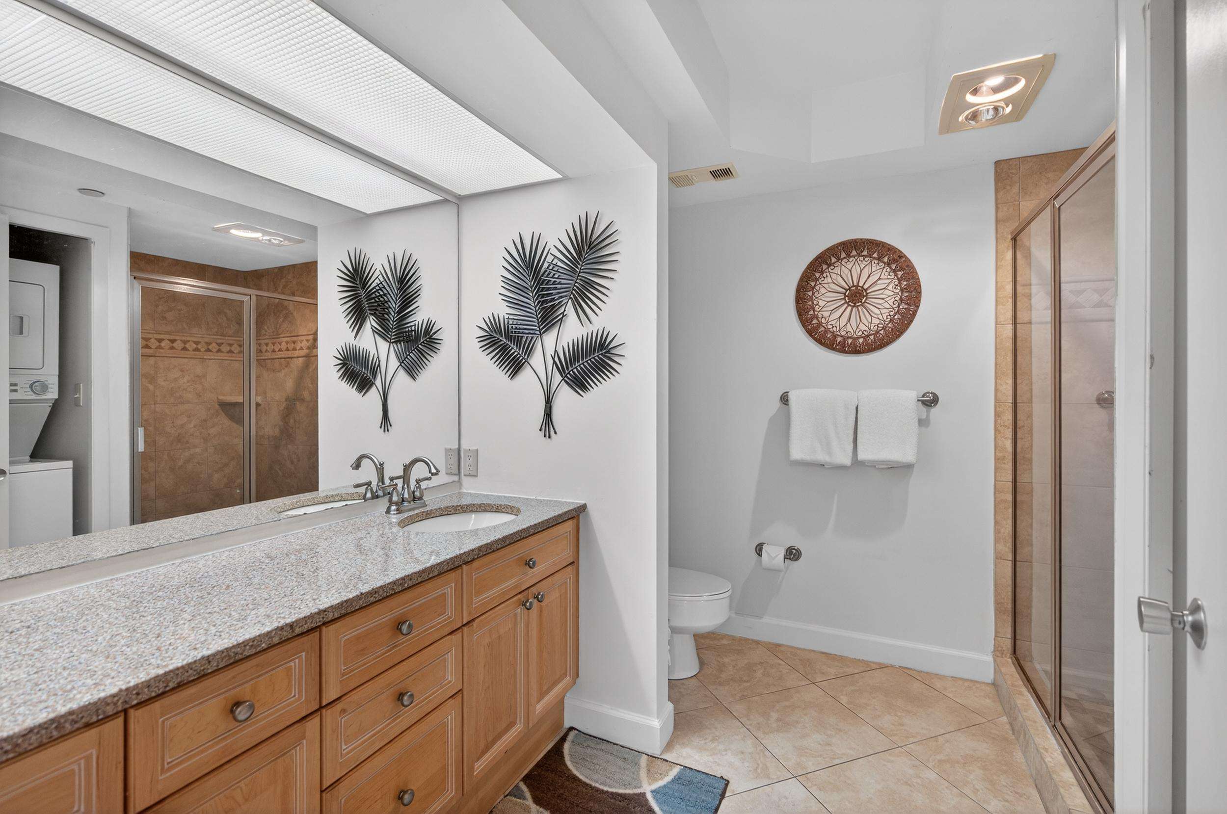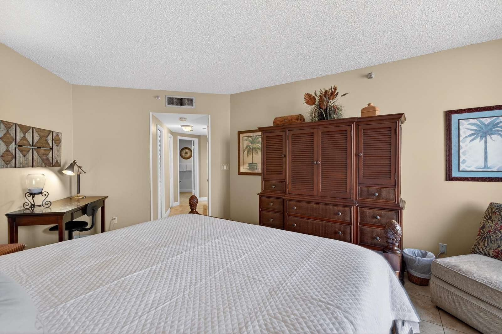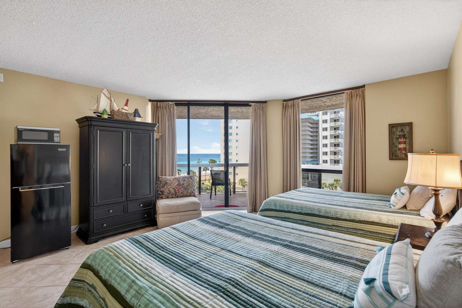 The large master features a a king-size bed, TV, large walk-in closet, and spacious master bath with large glass-enclosed tub/shower. The second bedroom features a queen bed TV and full bath. The 3rd bedroom has 2 queen beds beds, TV, large closet, full bath, small refrigerator, coffee pot, and microwave.